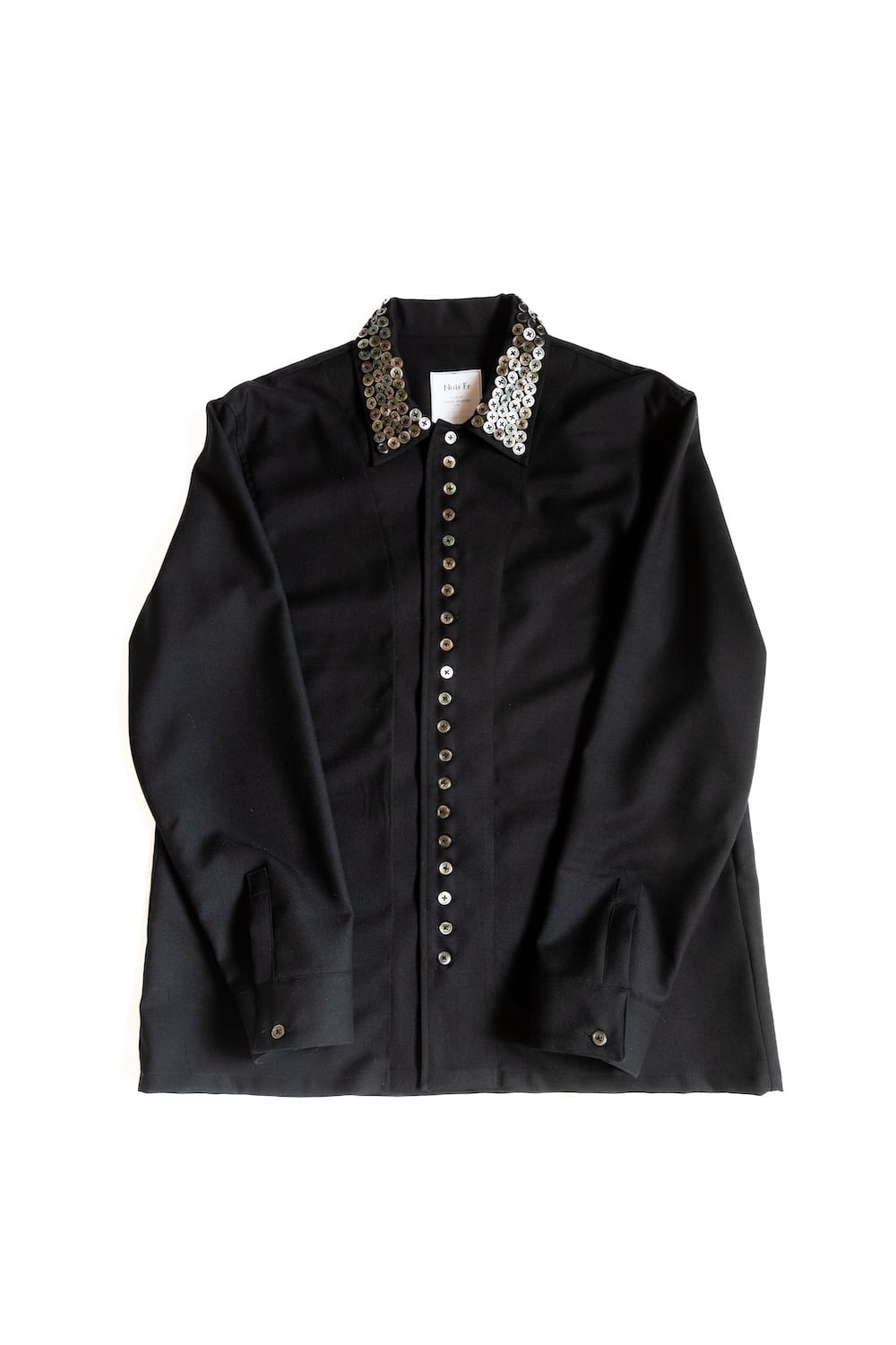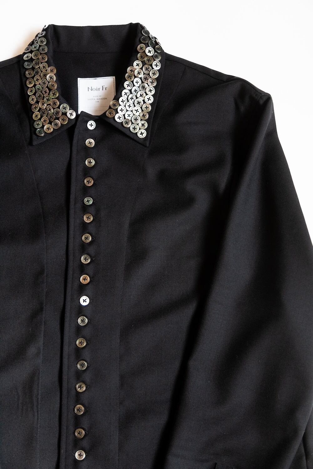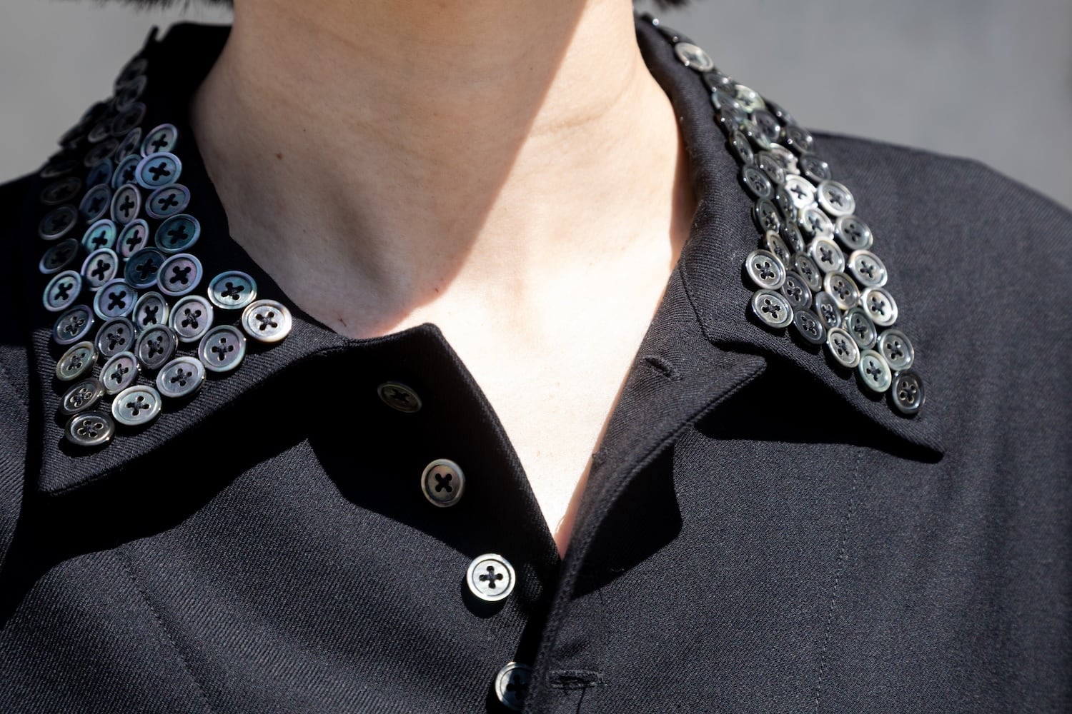 144個の貝ボタンを、全て手縫いでつけたウールシャツ。