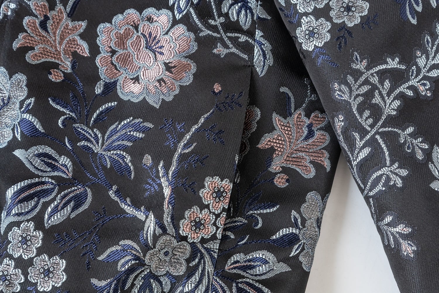 淡い花々が浮かぶジャガード生地にて仕立てたブルゾン。
