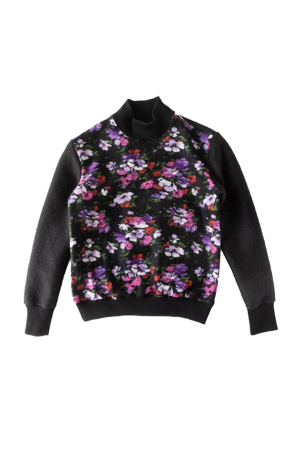 前面と背面中心に花柄のモヘア生地を配し、黒の無地部分には圧縮ウールニットを使用した1着。