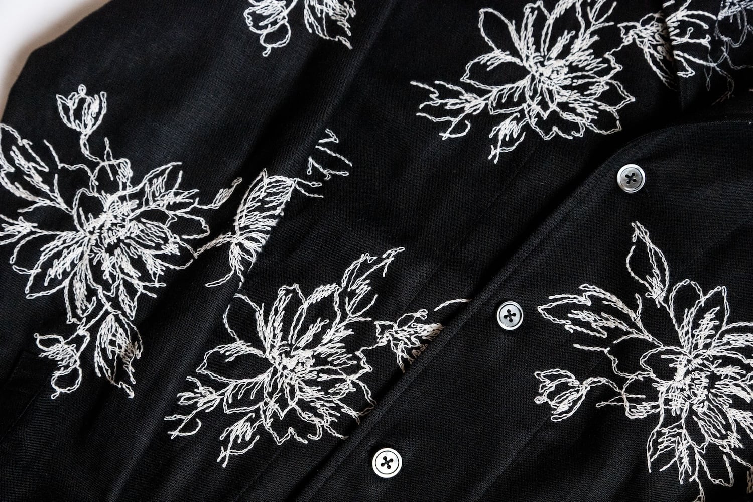 手書き風のお花の刺繍が沢山施されたレーヨンリネン生地で仕立てたオープンカラーシャツ。