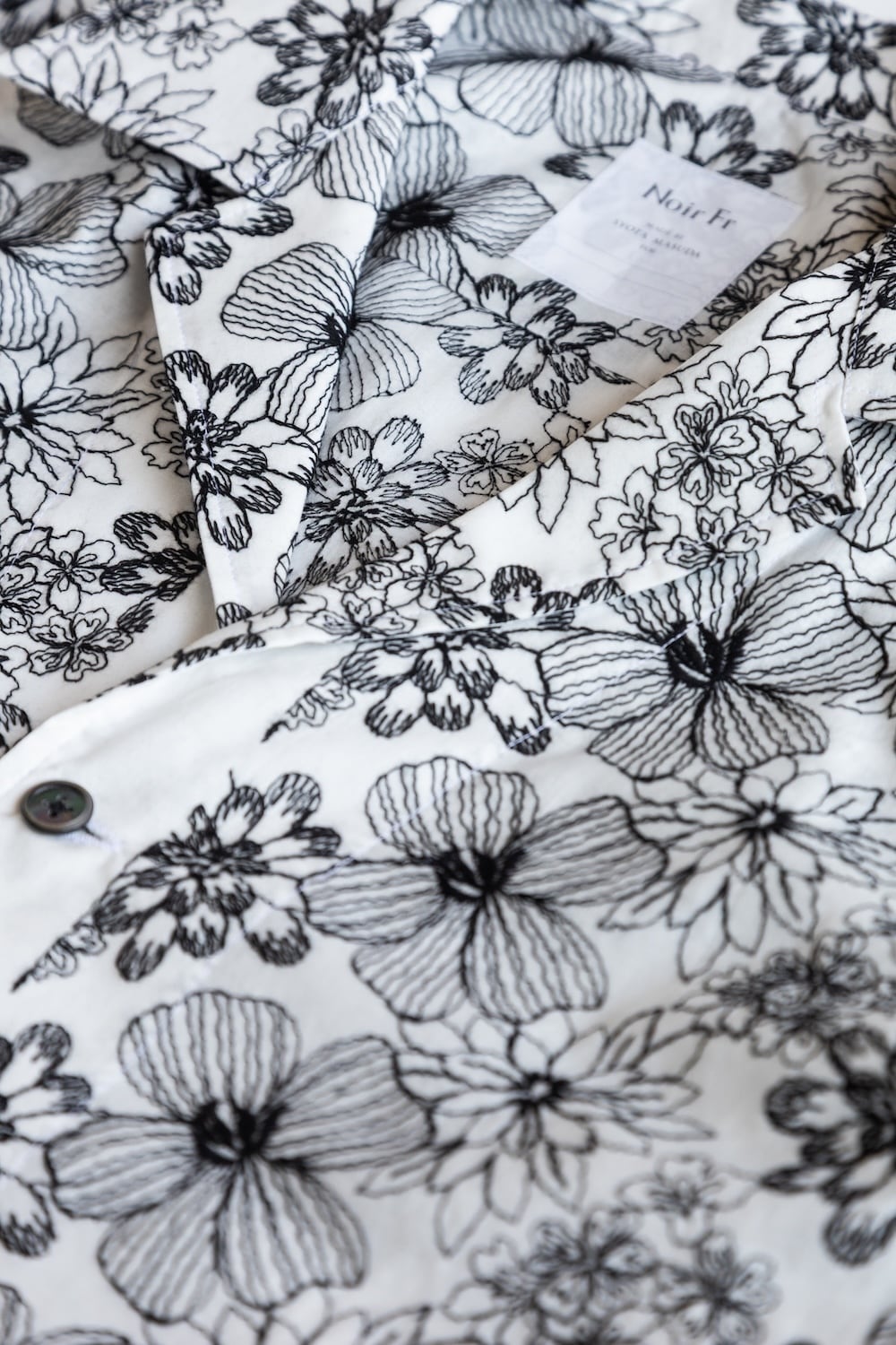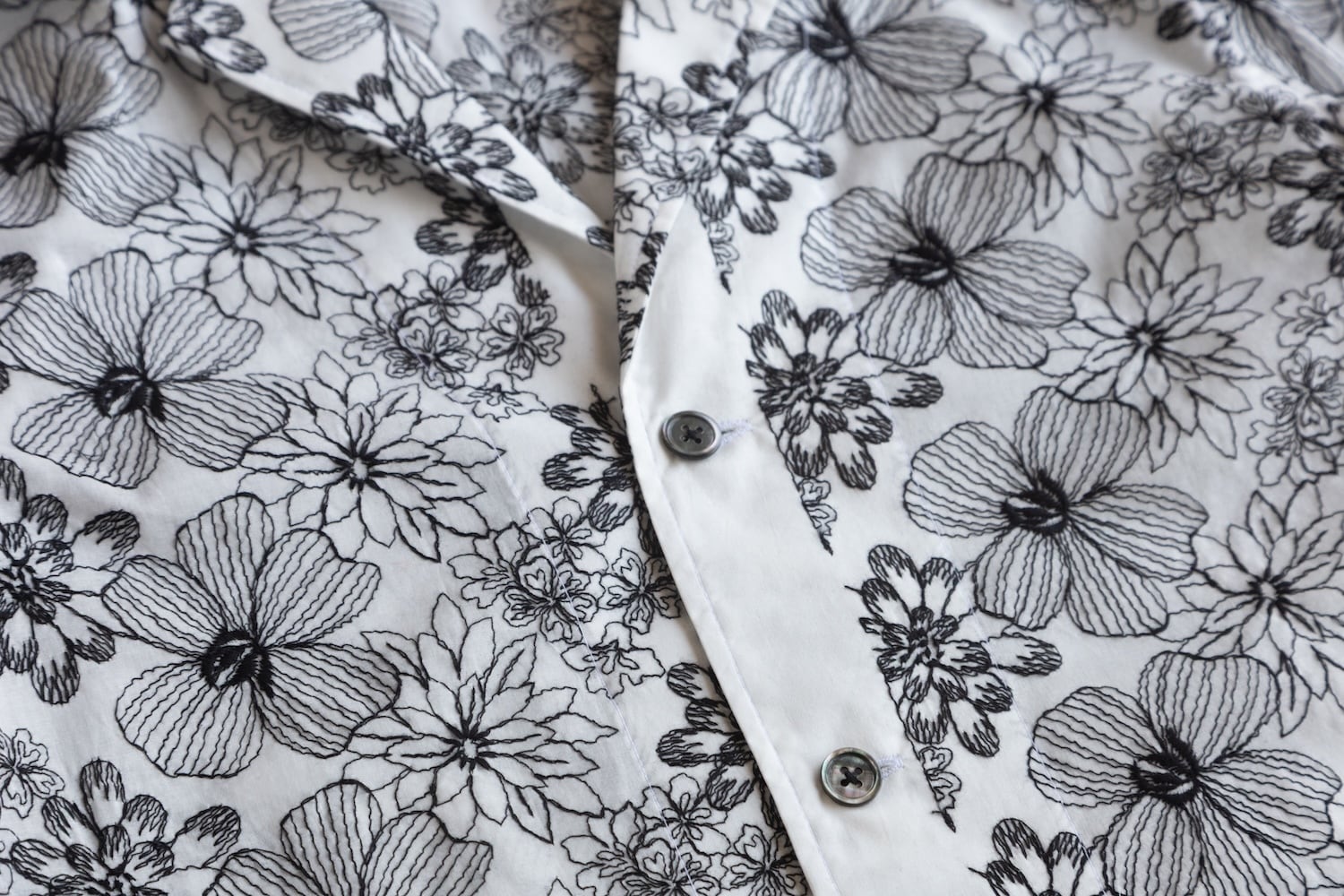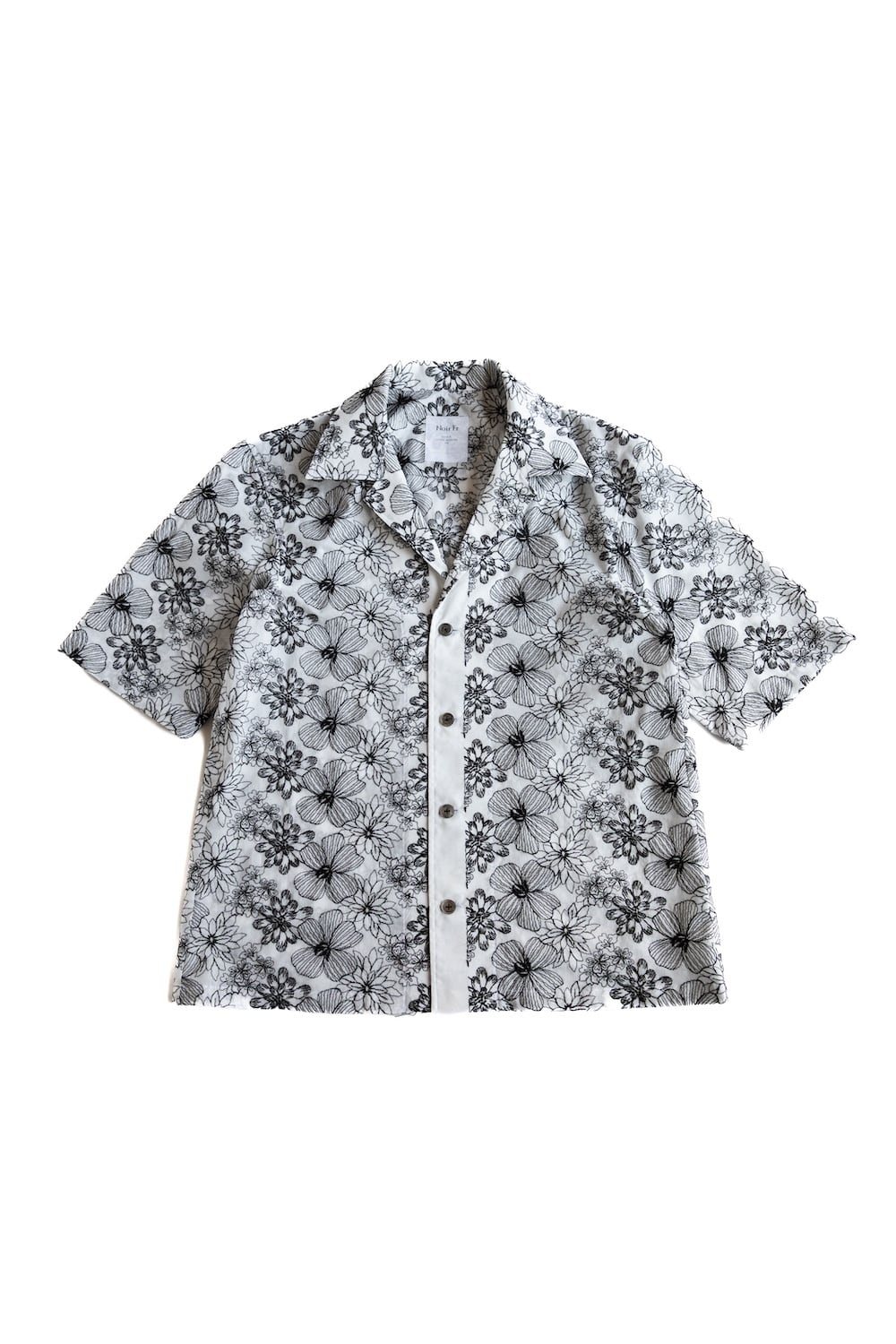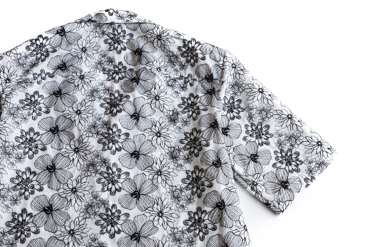 繊細なボタニカル柄の刺繍を全面にあしらった、オープンカラーの半袖シャツ。