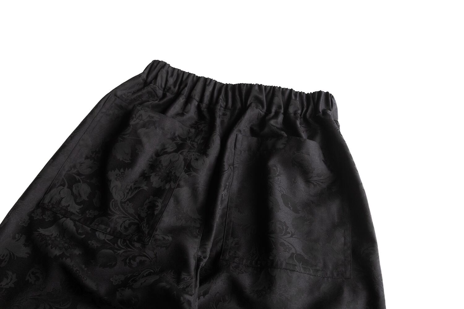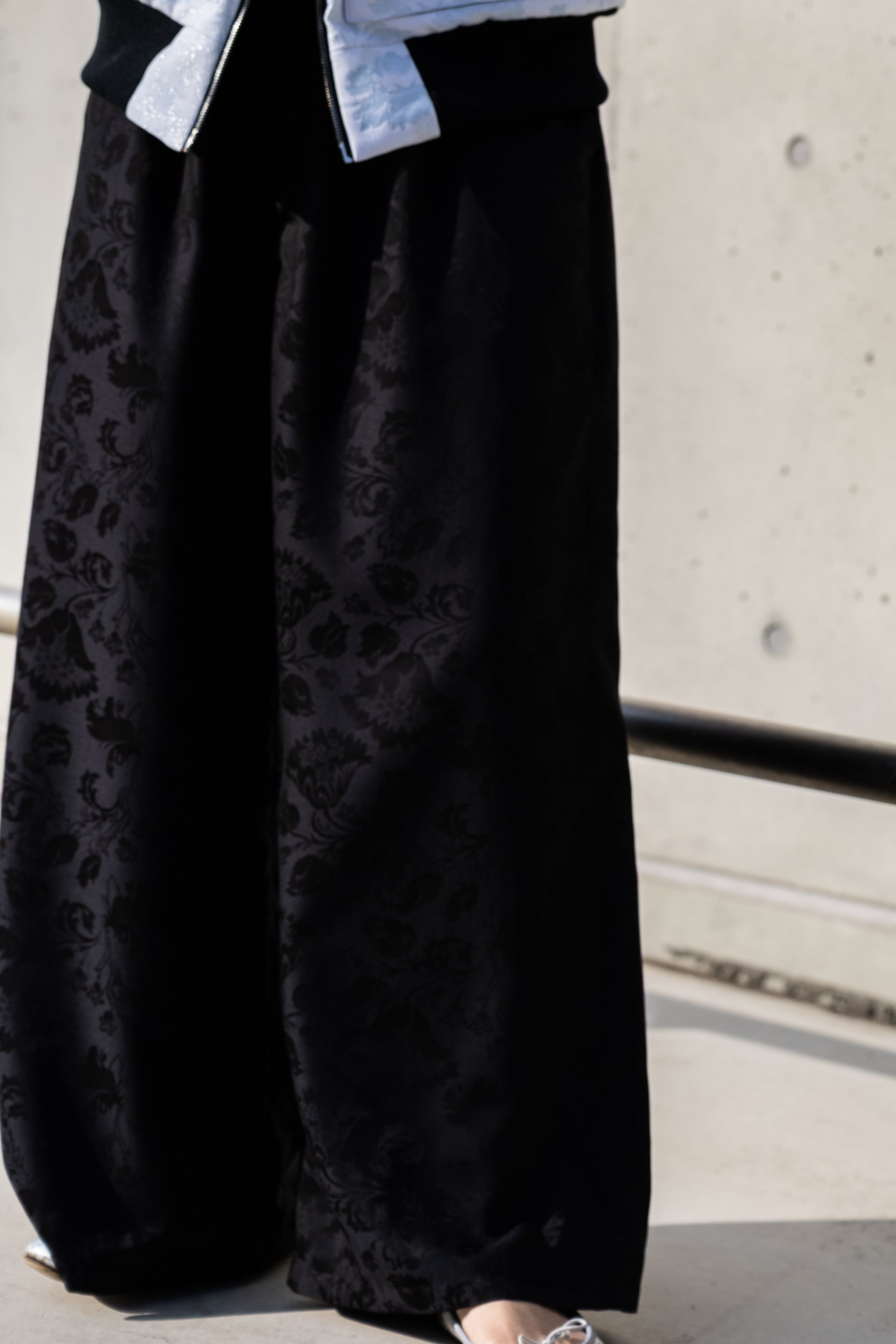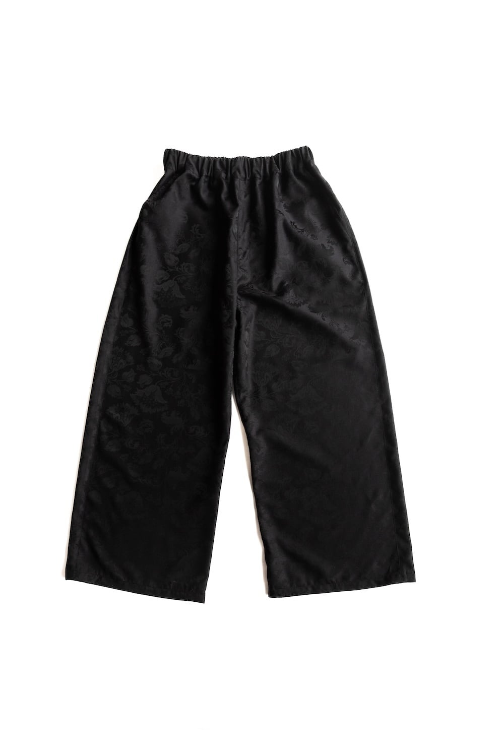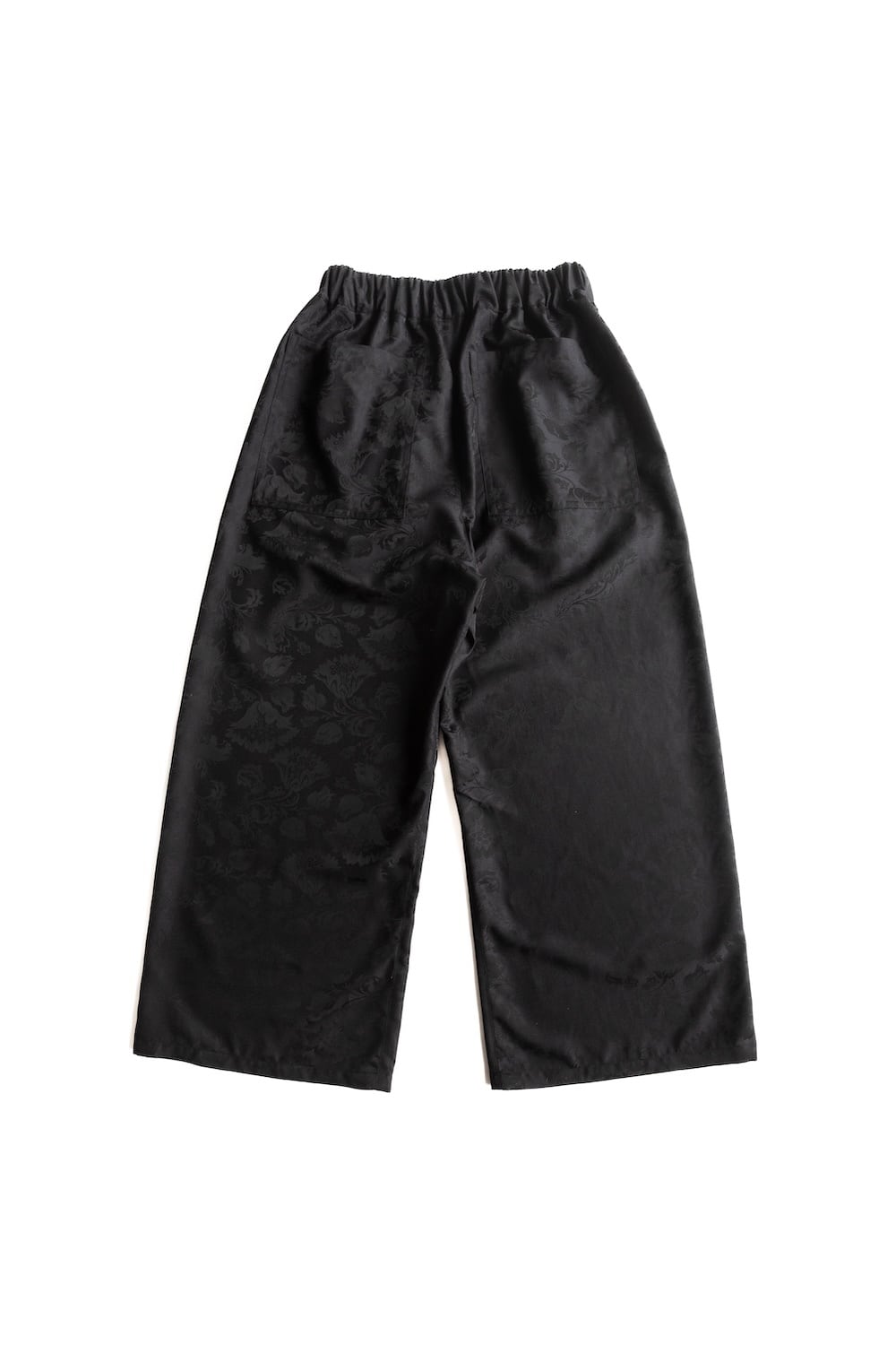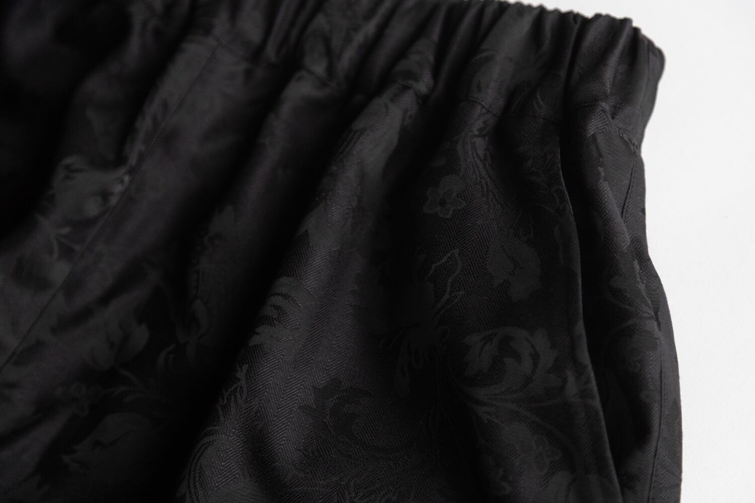 ブラックのフローラルジャカード生地を使用したワイドパンツ。