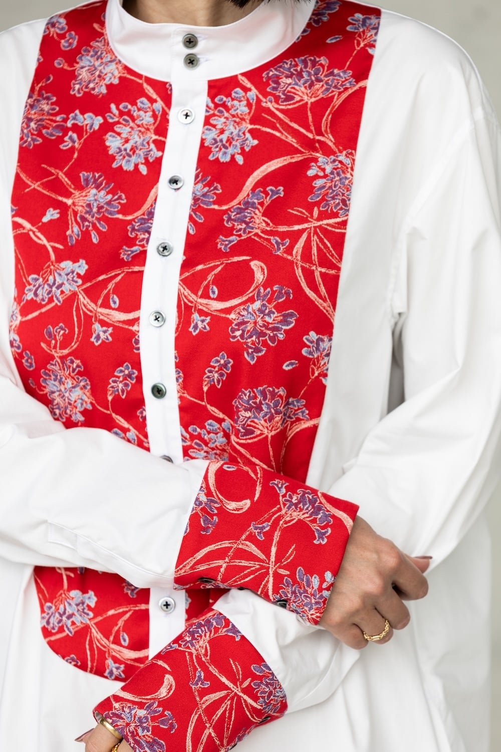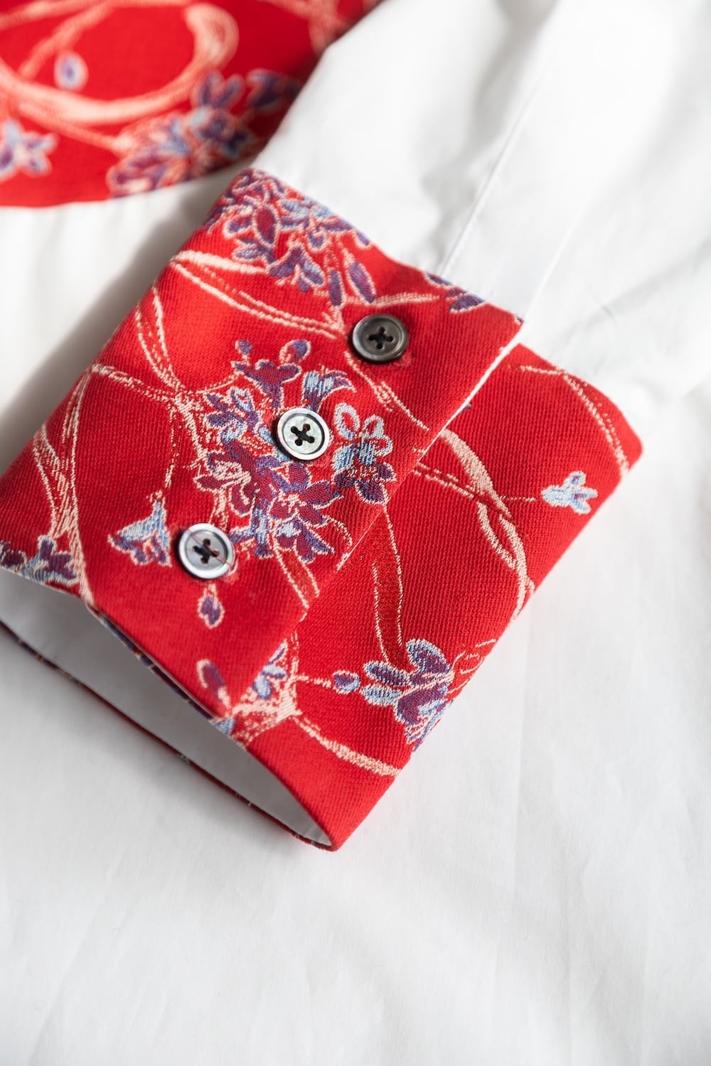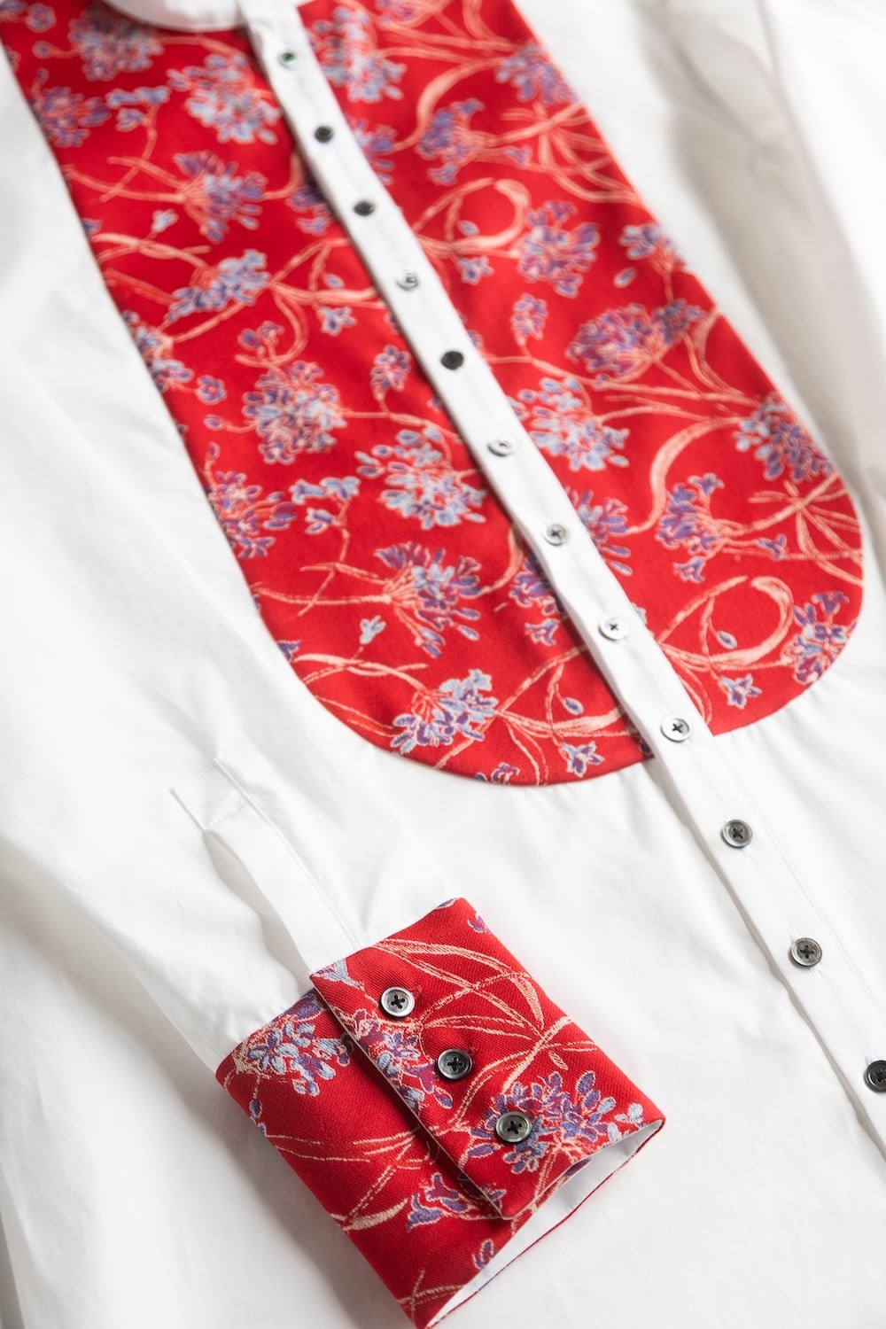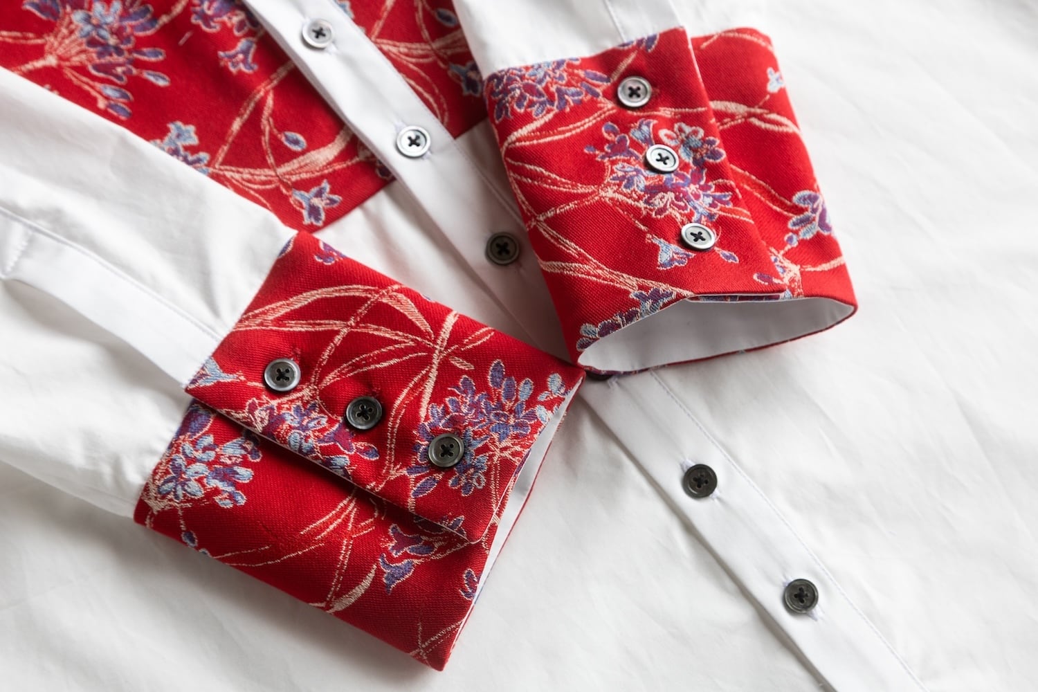 胸元とカフスには、赤が美しい花柄のジャガード生地を使用。