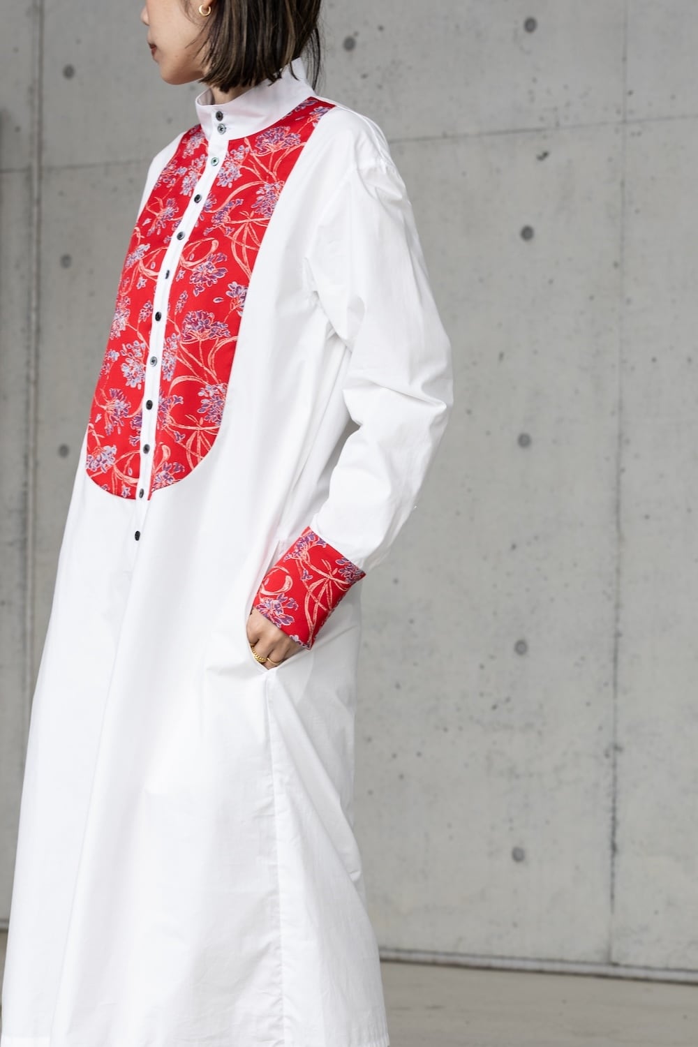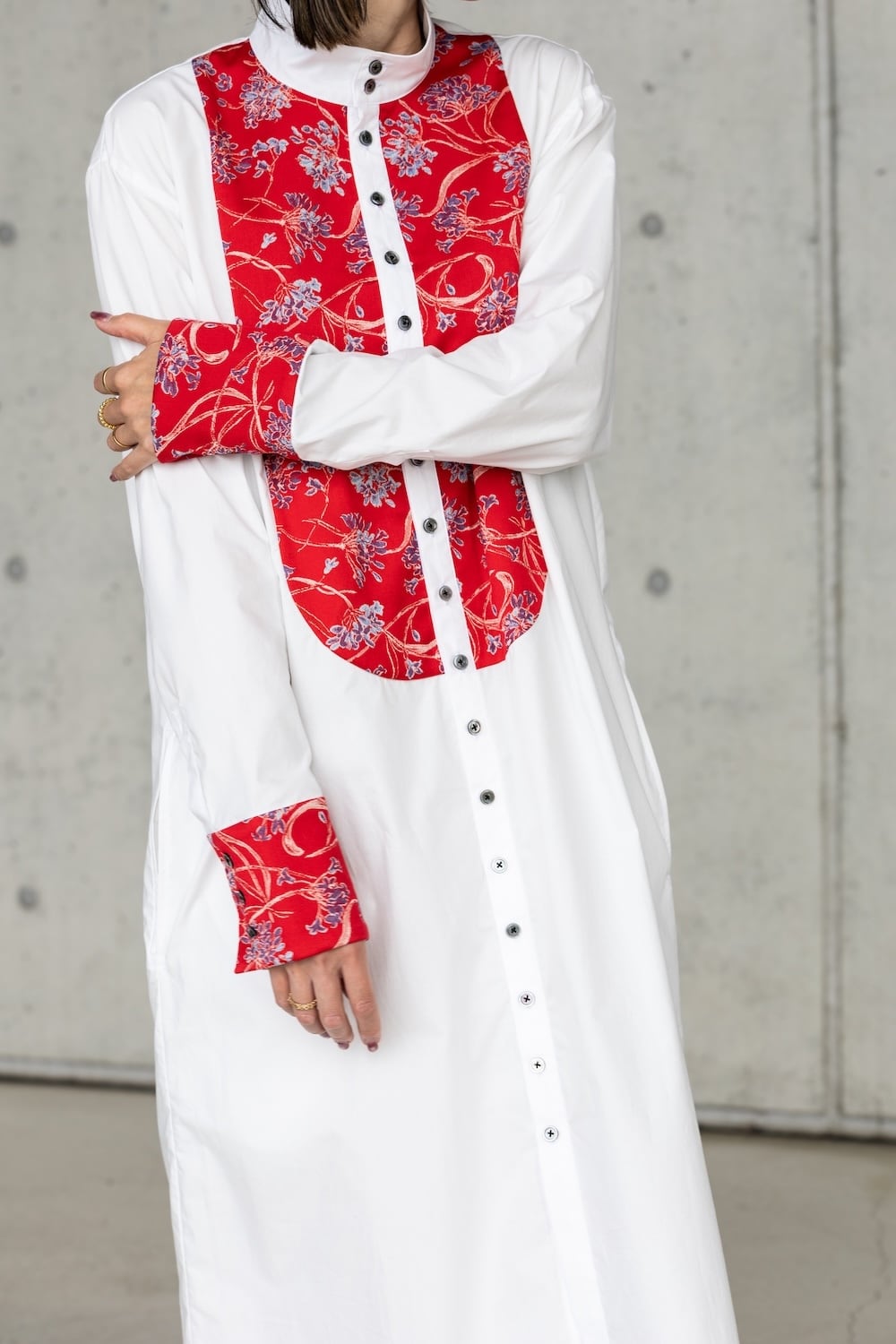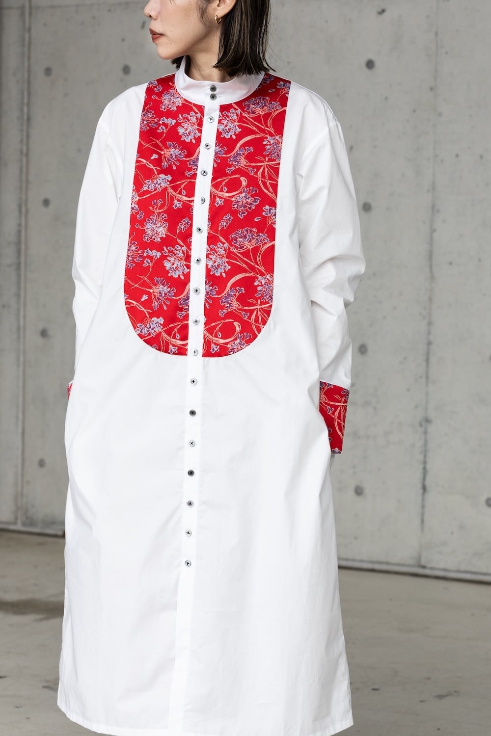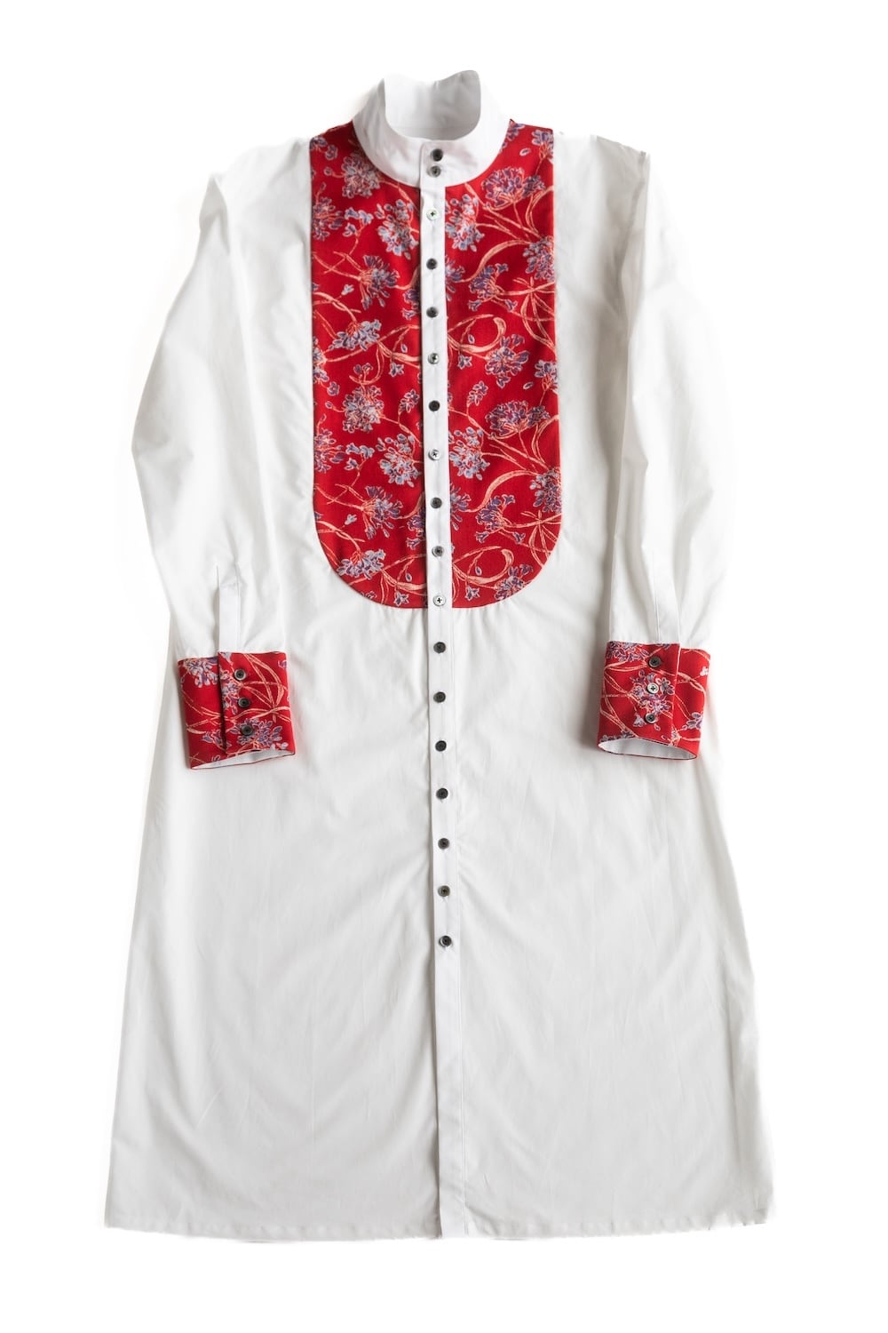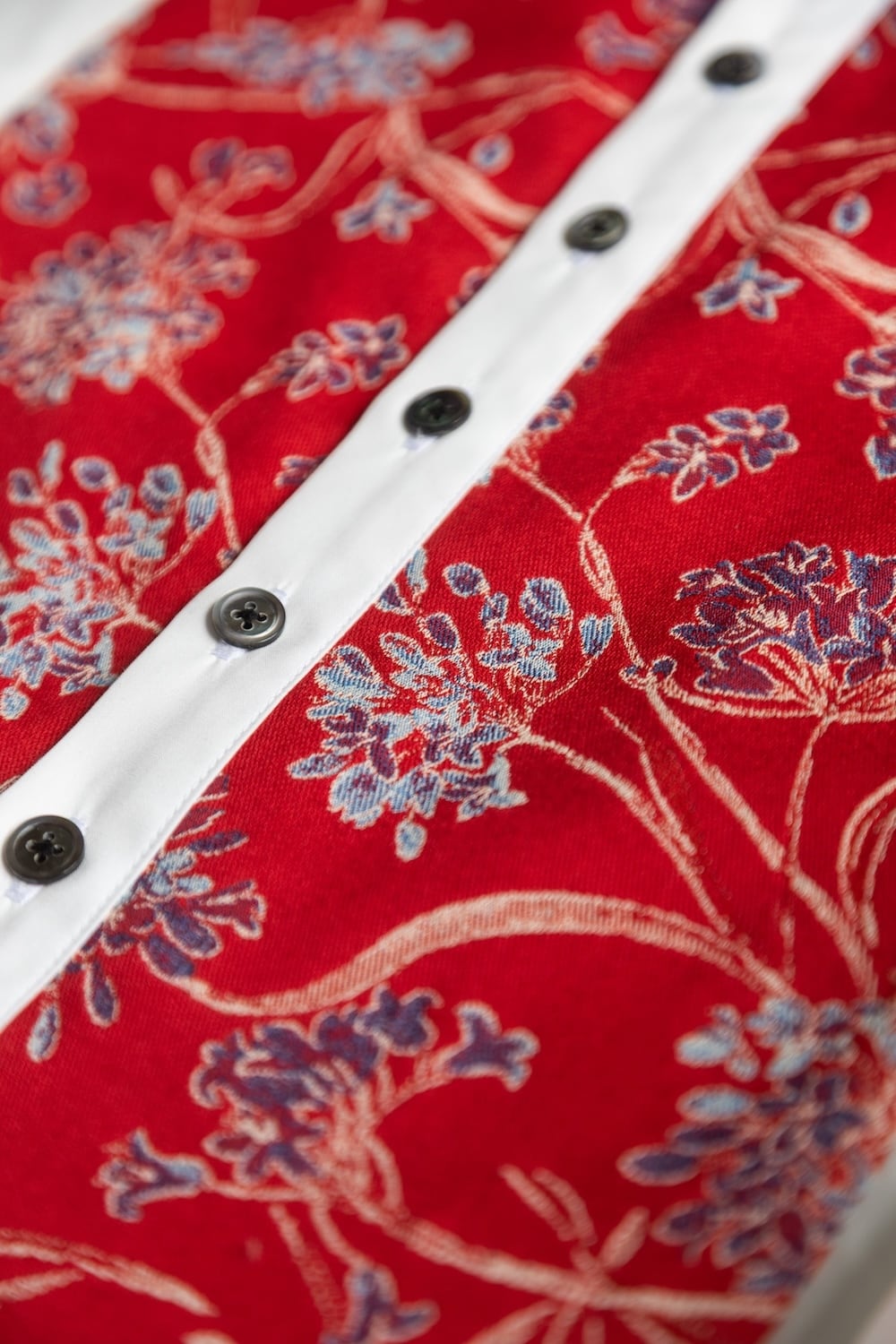 胸元とカフスには、赤が美しい花柄のジャガード生地を使用。