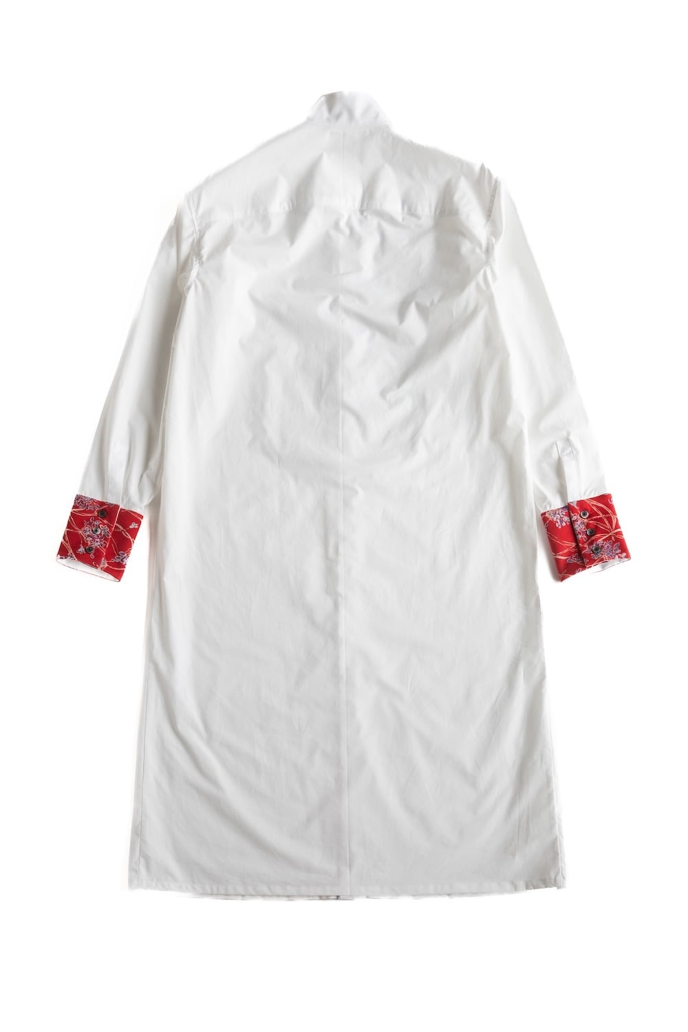 端正なシャツの佇まいに、鮮やかな赤のコントラスト。静けさと強さを併せ持つ一着。